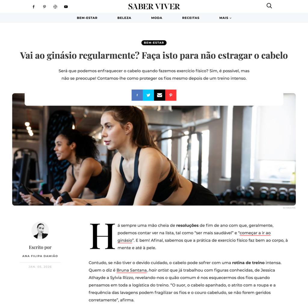 Contudo, se não tiver o devido cuidado, o cabelo pode sofrer com uma rotina de treino intensa. Quem o diz é Bruna Santanahair artist que já trabalhou com figuras conhecidas, de Jessica Athayde a Sylvia Rizzo, revelando-nos o quão comum é nos esquecermos dos fios quando pensamos em toda a logística do treino. “O suor, o cabelo apanhado, o atrito com a roupa e a frequência das lavagens podem fragilizar os fios e o couro cabeludo, se não forem geridos corretamente”, afirma.